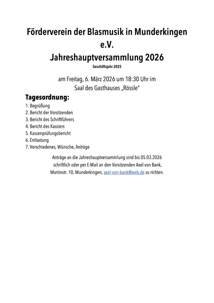 Einladung zur Hauptversammlung der Stadtkapelle Munderkingen e.V.